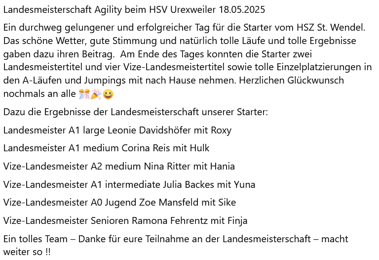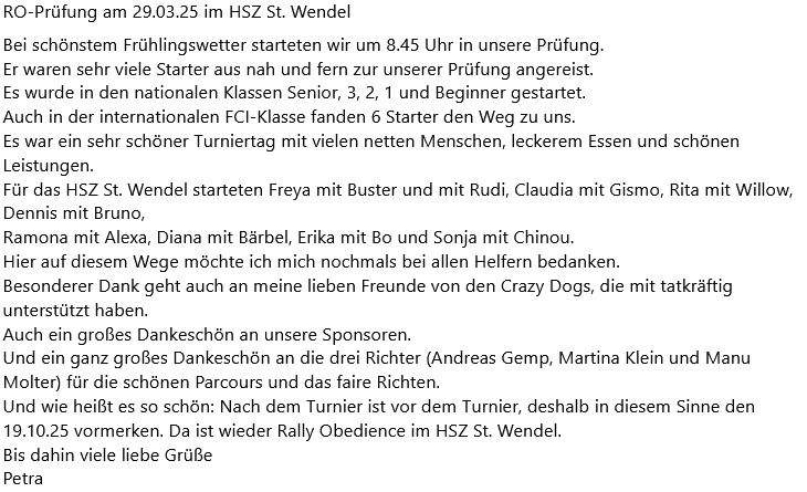 Wir würden uns freuen, Euch bei unserem Herbstturnier hier beim Hundesportzentrum St. Wendel wieder begrüßen zu dürfen. Bis dahin wünschen wir Euch eine erfolgreiche Turniersaison ![]()